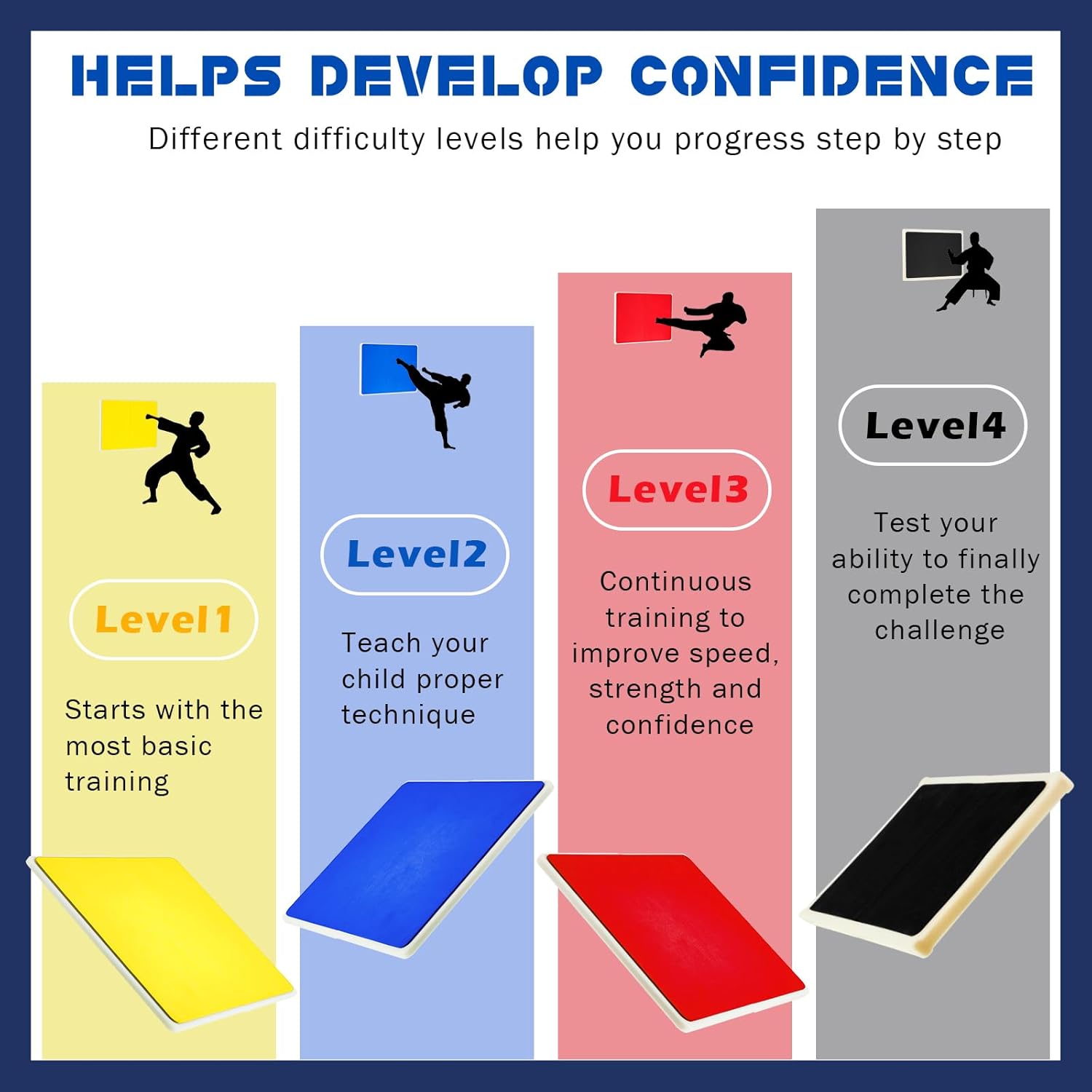 • Progressive Difficulty: The four color-coded boards (Yellow, Blue, Red, Black) align with belt ranks, allowing you to train with increasing difficulty as you advance.